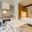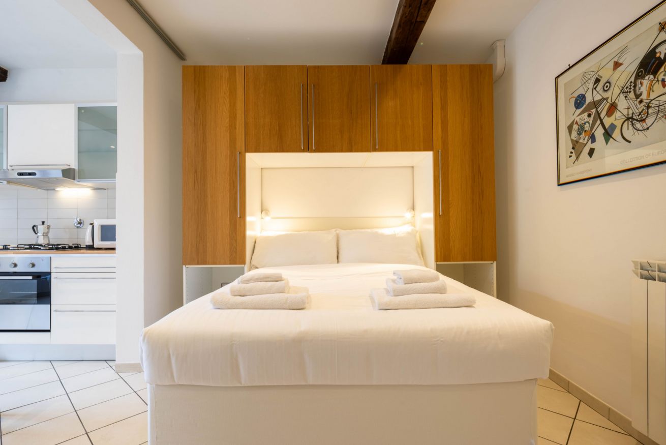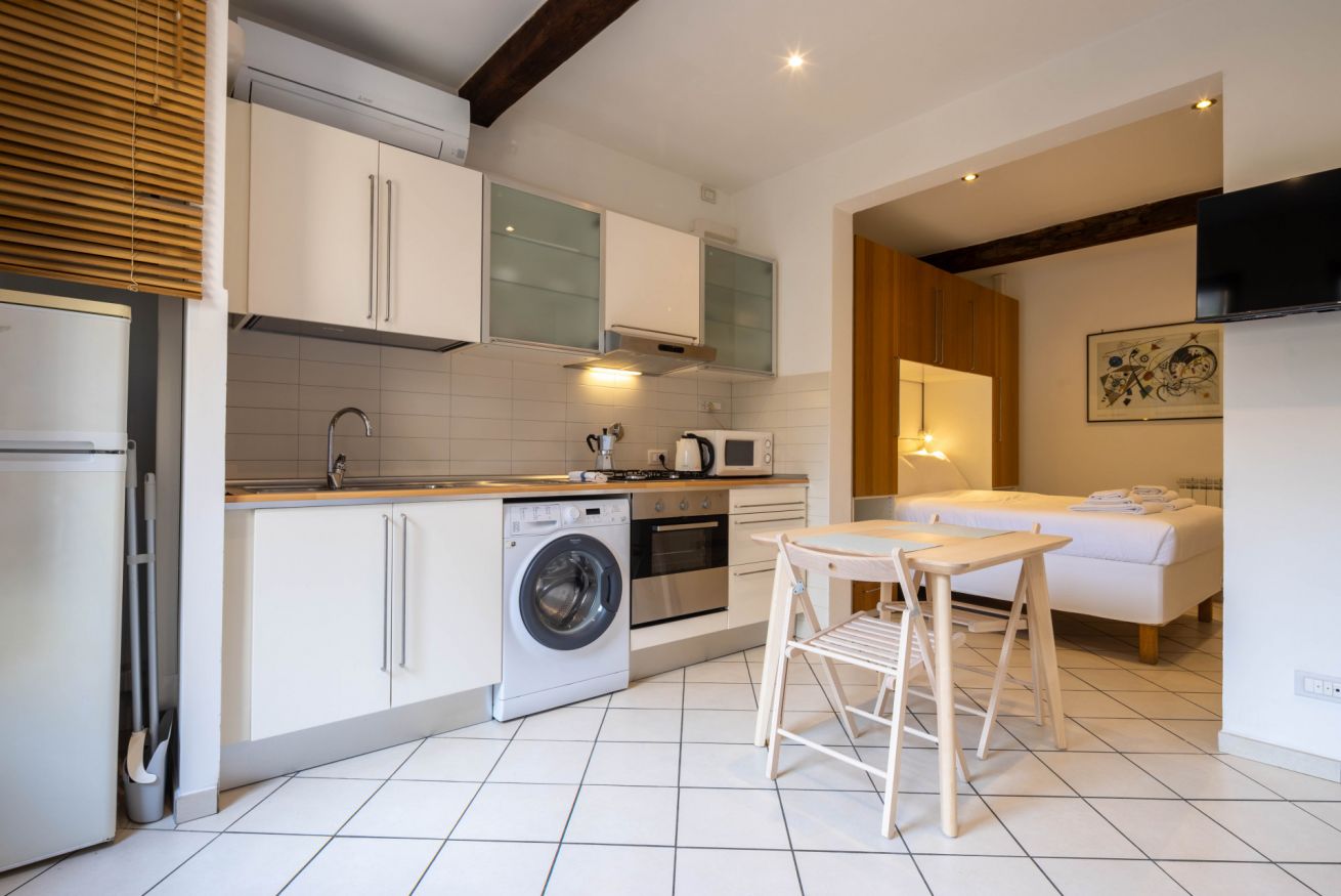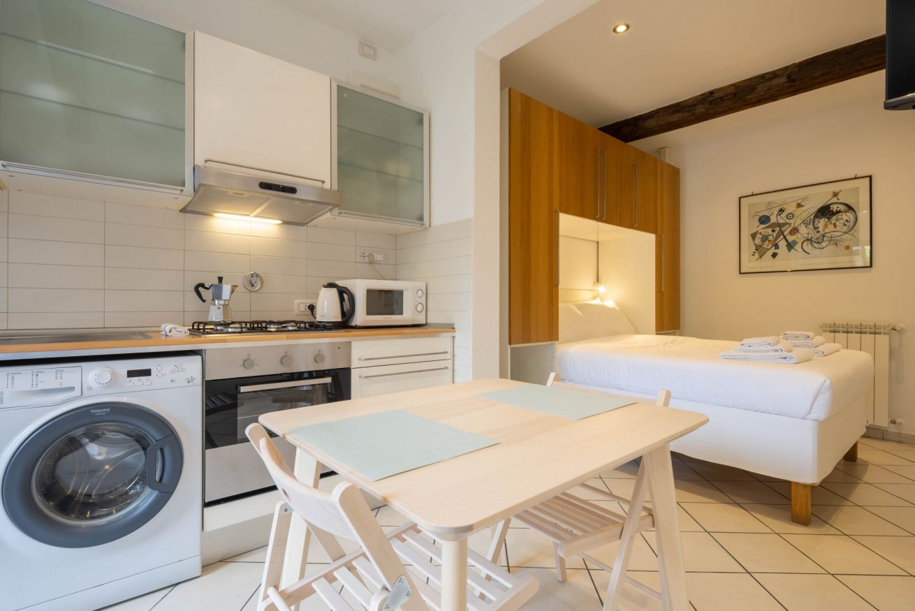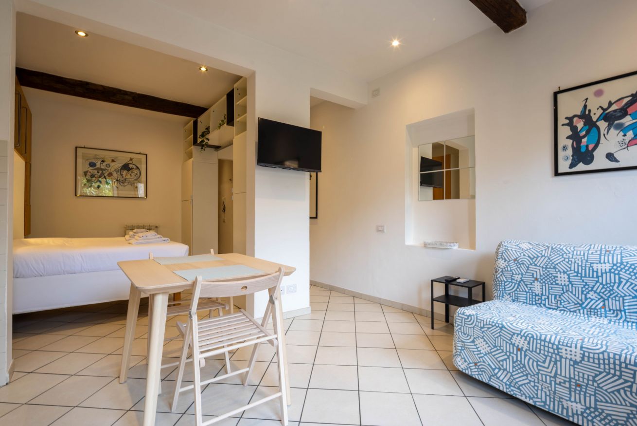 L'ambiente unico comprende una cucina completamente accessoriata con tutti i comfort, inclusa una lavatrice, perfetta sia per soggiorni brevi che prolungati. La zona notte dispone di un comodo letto matrimoniale, mentre l'area soggiorno è arredata con un divano letto matrimoniale, TV e un tavolo da pranzo per quattro persone. Completa l’appartamento un bagno privato con doccia.