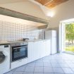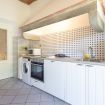 La cucina, alla quale si accede salendo qualche gradino, è spaziosa e completamente attrezzata con forno, microonde, piano cottura in vetroceramica, tostapane, lavatrice, lavastoviglie e tutto il necessario per cucinare come a casa propria.