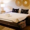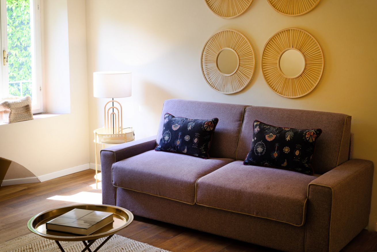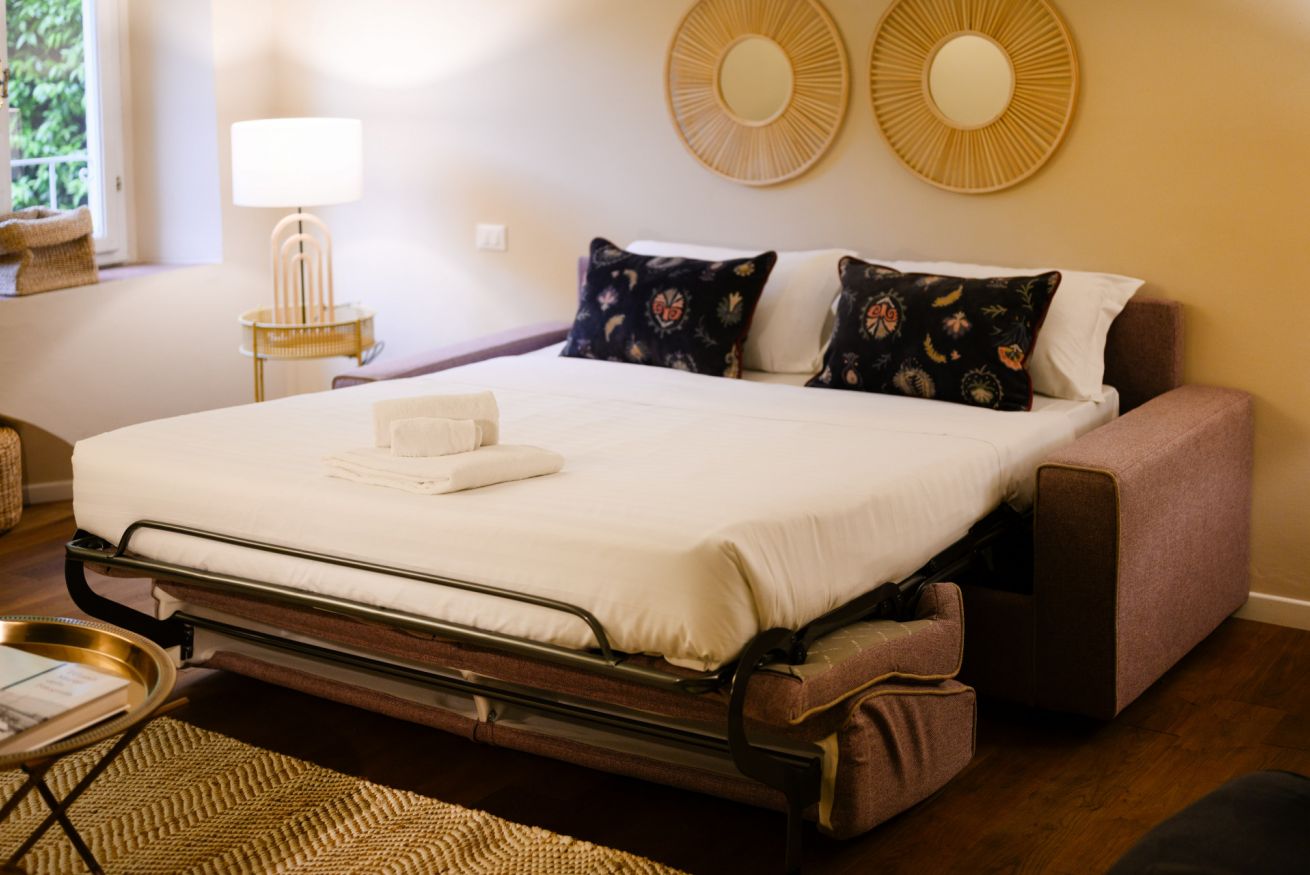 Il soggiorno è accogliente e funzionale, con comodo divano letto doppio, TV, aria condizionata e connessione Wi-Fi gratuita ad alta velocità, perfetta per chi desidera restare sempre connesso.