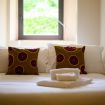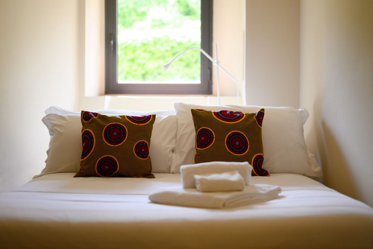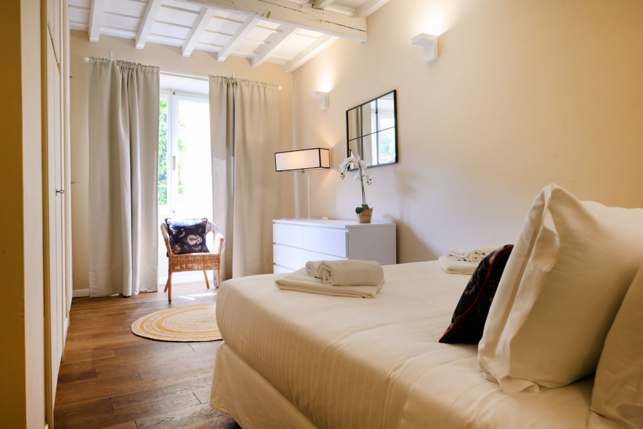 Le due camere matrimoniali, entrambe con aria condizionata, offrono spazi confortevoli: una dispone di un ampio armadio ed è situata all’interno dell’appartamento principale, mentre la seconda si trova esternamente, sullo stesso pianerottolo, offrendo maggiore riservatezza.