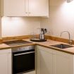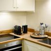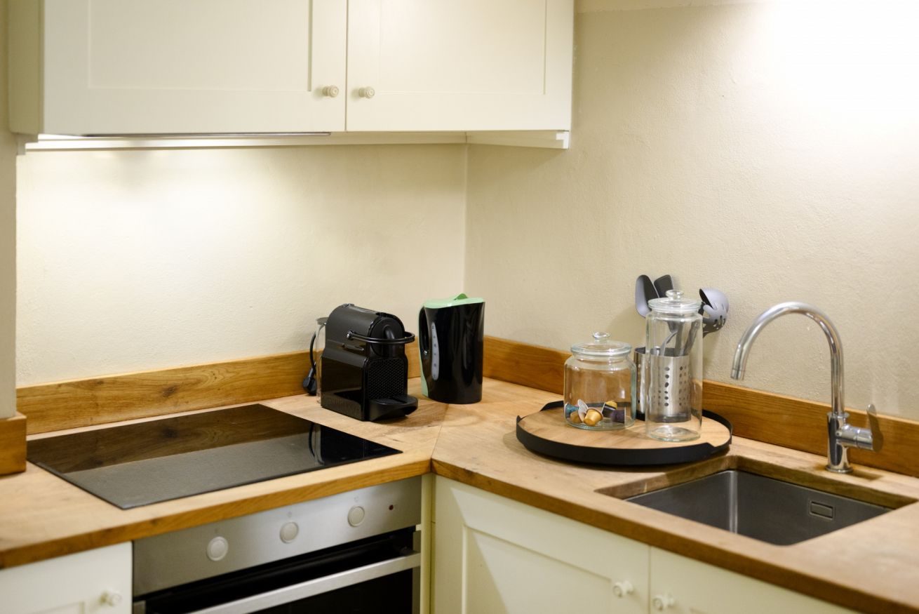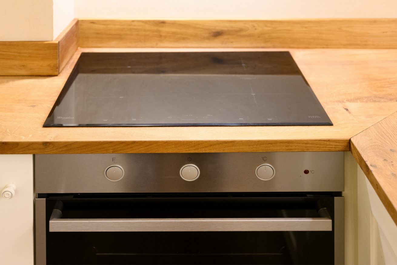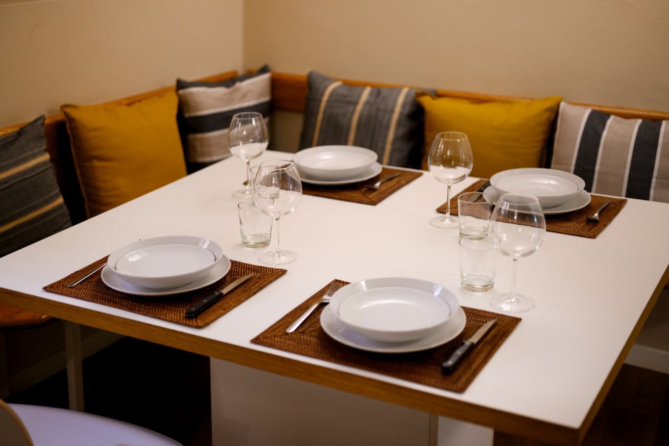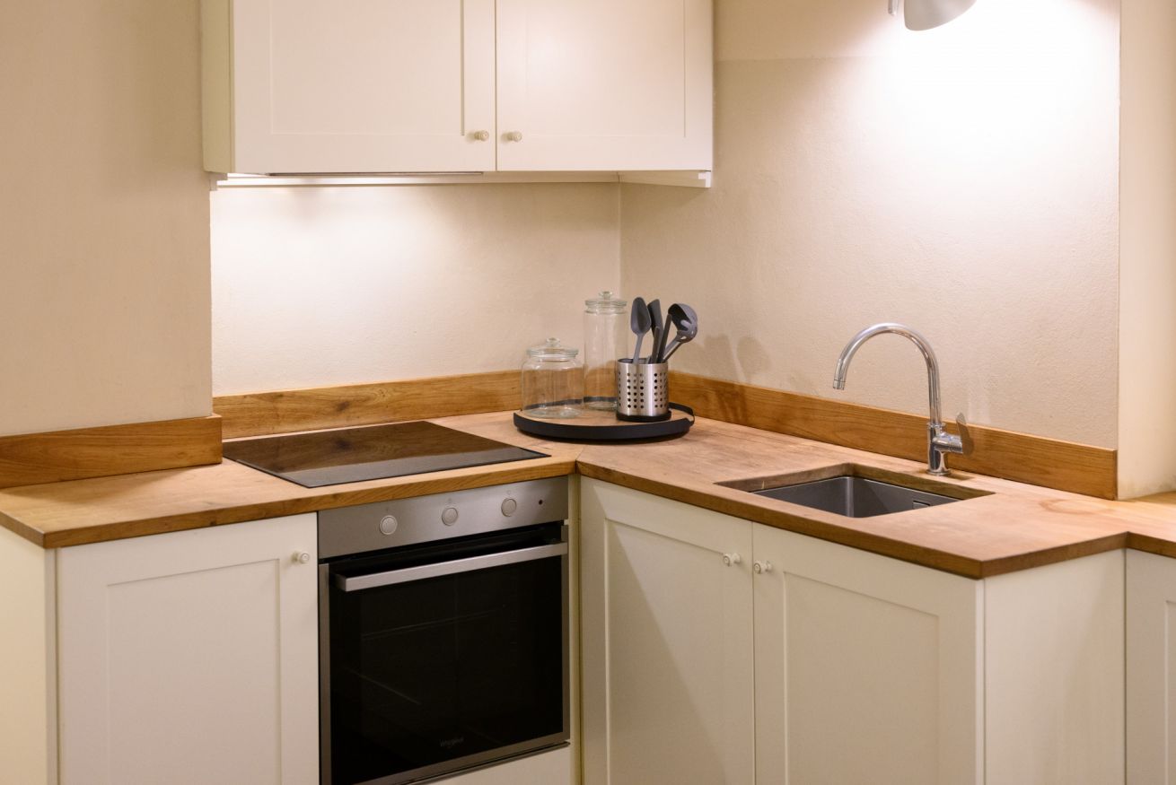 La cucina è moderna e ben accessoriata, dotata di forno, piano cottura a induzione, macchina Nespresso e tutto il necessario per preparare piatti da gustare nella comoda zona pranzo, il tutto climatizzato con aria condizionata.