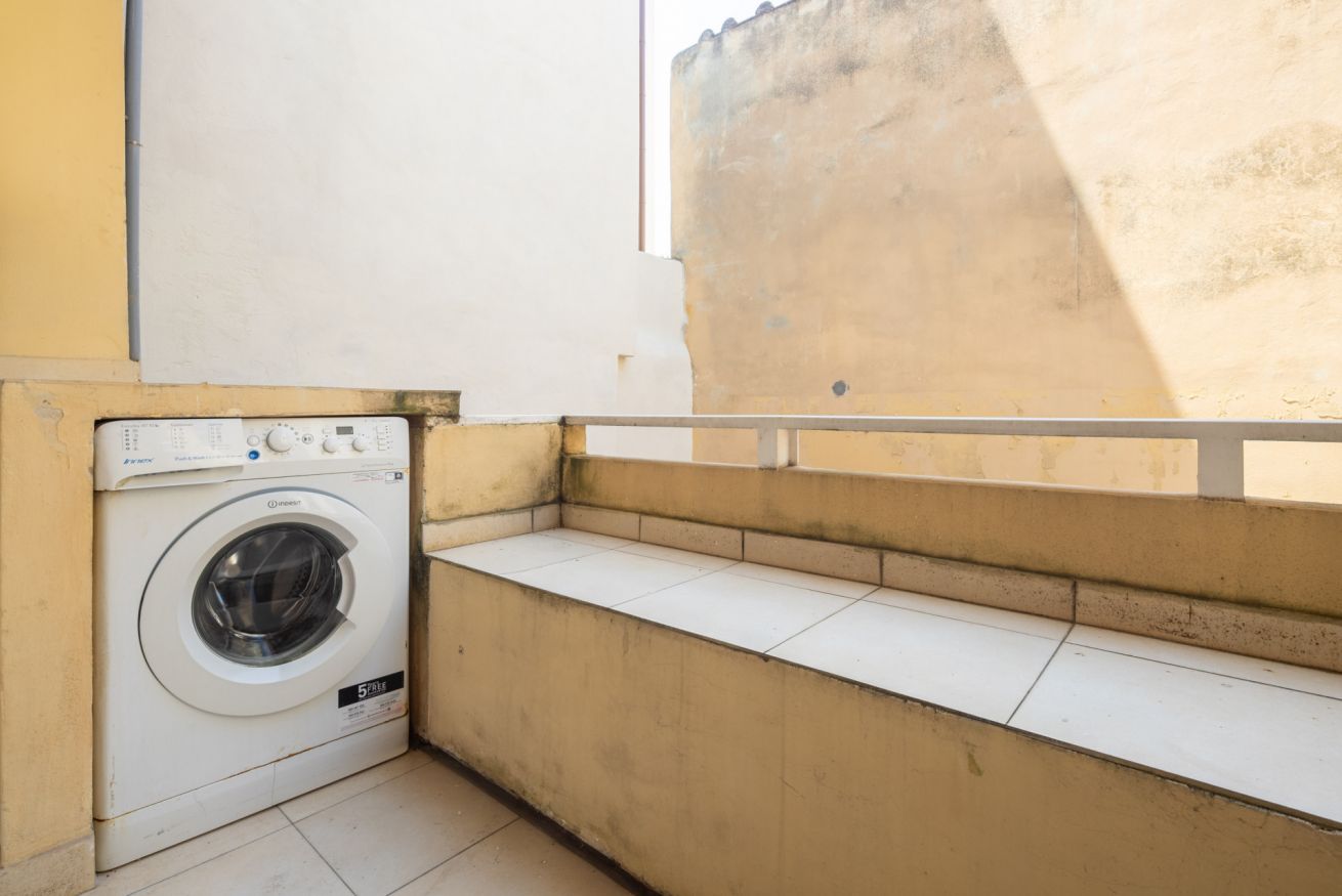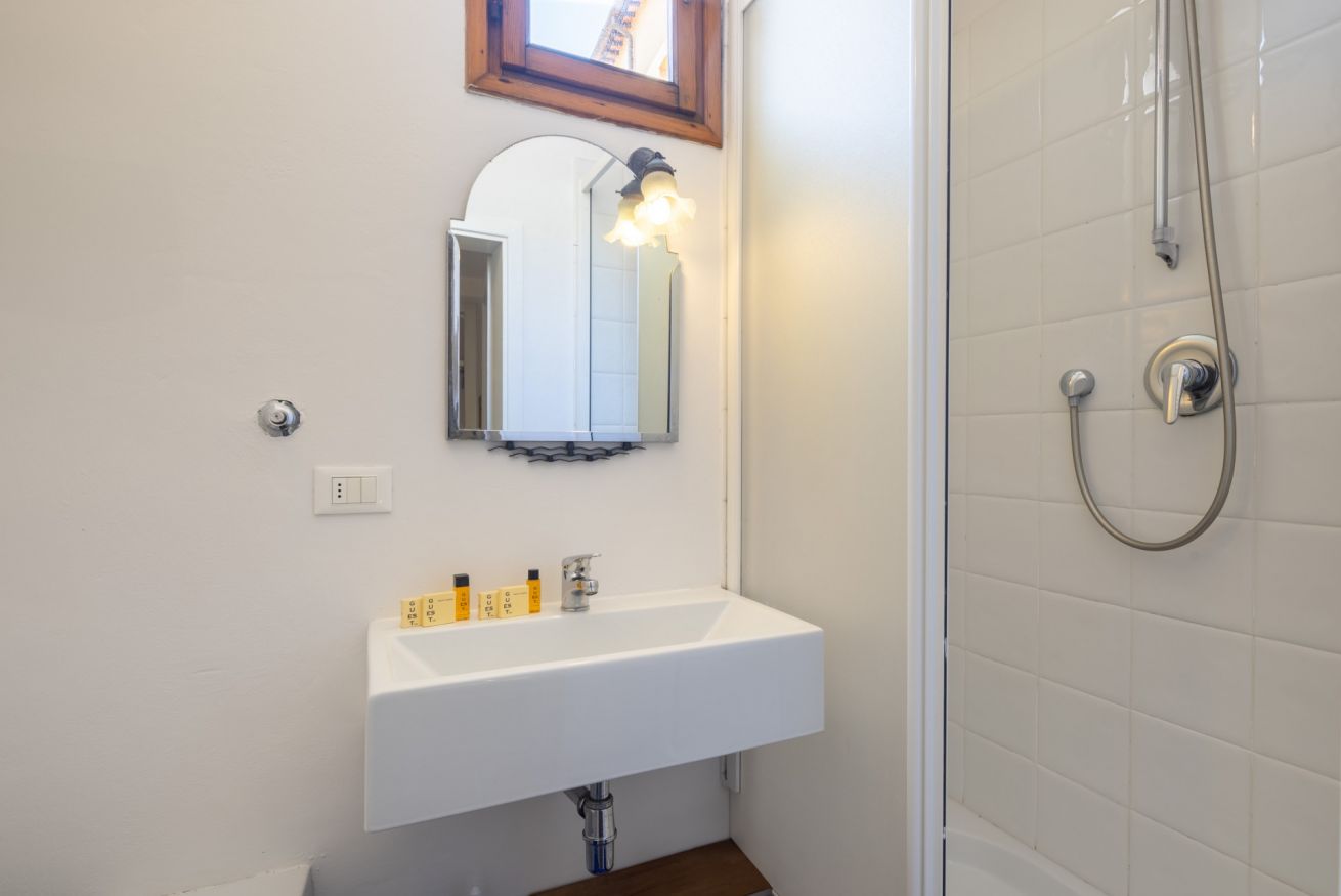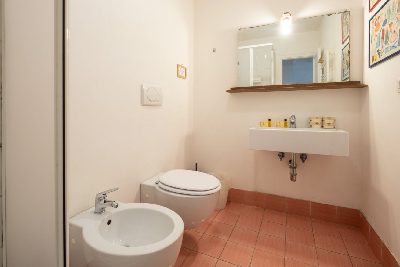 La terza camera, anch’essa spaziosa e dotata di armadio, si affaccia su un balconcino privato dove si trova la lavatrice. L’appartamento comprende inoltre un terzo bagno esterno con doccia, particolarmente utile per famiglie o gruppi numerosi.