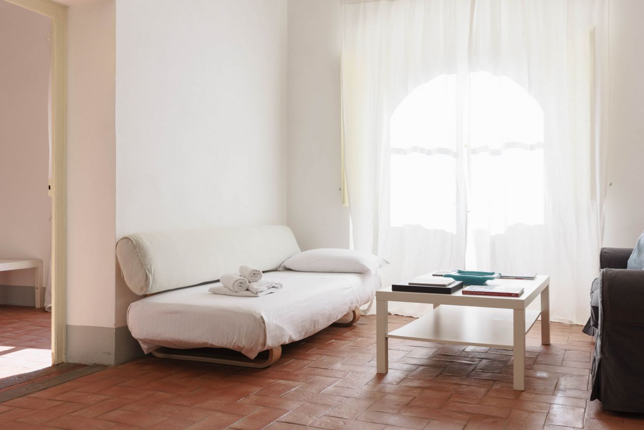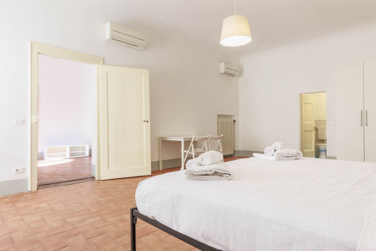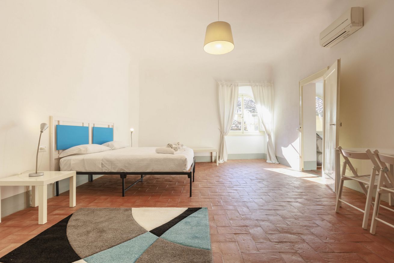 L’appartamento si estende su una superficie di 100 m² e può ospitare fino a quattro persone. Dispone di una camera da letto molto spaziosa con un letto king-size che può essere preparato anche come due letti singoli, oltre a un grande armadio e una scrivania adatta allo smart working. Il bagno privato è dotato di doccia e lavatrice. L’ampia zona living open space offre due divani, un angolo pranzo e una TV, creando uno spazio accogliente in cui rilassarsi dopo una giornata trascorsa alla scoperta di Firenze. L’angolo cottura compatto è attrezzato con piano cottura, forno, lavastoviglie, tostapane, bollitore e macchina da caffè, perfetto per preparare pasti semplici. La struttura dispone di aria condizionata, Wi-Fi e comfort essenziali; è inoltre possibile richiedere una culla per bambini.