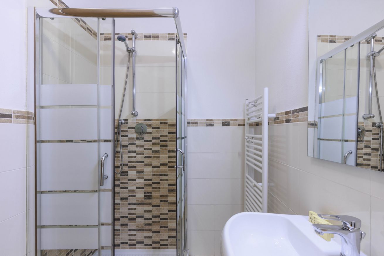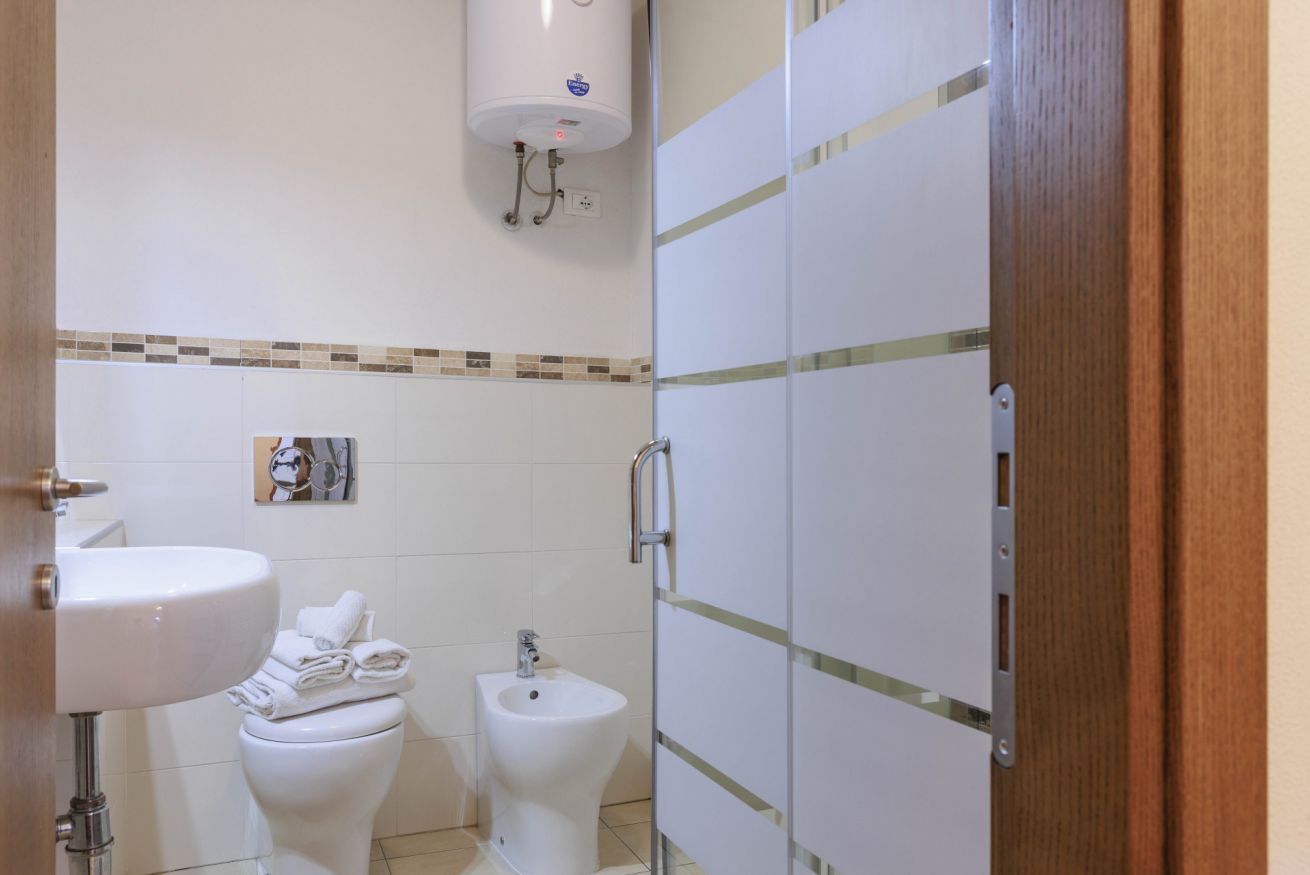 Il soggiorno include un divano letto e una TV, offrendo uno spazio funzionale in cui rilassarsi dopo una giornata in città. La cucina comprende tutto il necessario per preparare pasti semplici: tostapane, bollitore, microonde, piano cottura in vetroceramica, forno, frigorifero e freezer. L’appartamento dispone anche di due bagni, entrambi con doccia, un dettaglio molto comodo per gruppi o famiglie.