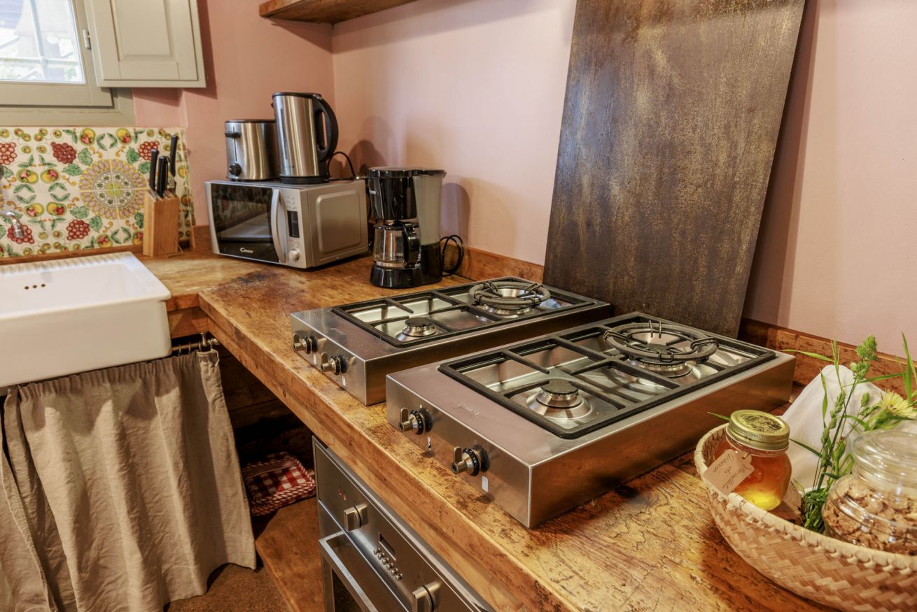 La zona giorno open space ospita un salotto luminoso e una cucina completamente attrezzata con piano cottura a gas, forno, tostapane, bollitore, lavastoviglie e macchina da caffè — perfetta per chi ama cucinare e vivere la casa come un vero rifugio.
