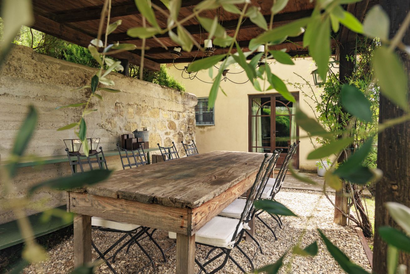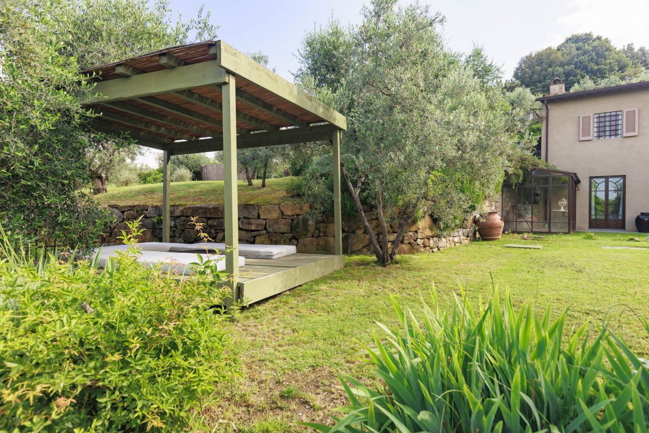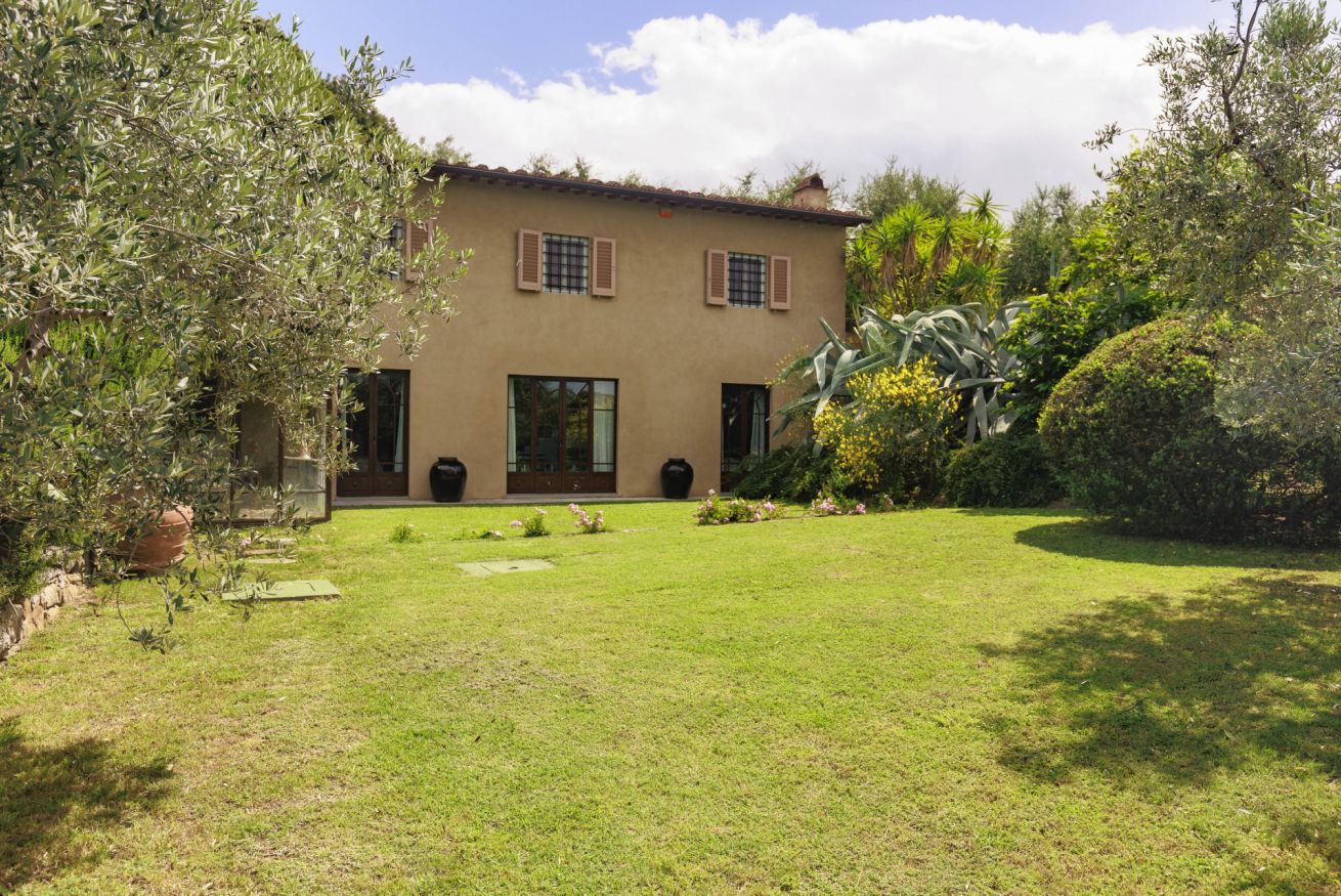 Dalla villa, che si apre su un ampio giardino privato, si possono ammirare scorci incantevoli della campagna toscana e godere di momenti di puro relax: una colazione all’aperto, una cena al tramonto o un pomeriggio tranquillo accanto alla piscina immersa nel verde.