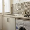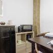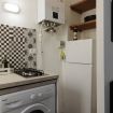 L’appartamento di 45 m² presenta una zona giorno open space con divano letto, angolo pranzo e una cucina compatta ma completa di tutto: macchina Nespresso, bollitore, piccolo forno elettrico, fornelli, frigorifero, freezer e lavatrice. Sono disponibili pentole, stoviglie e tutto l’essenziale per cucinare pasti semplici.