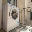 La camera da letto matrimoniale offre un letto doppio, TV, aria condizionata, ampio armadio e accesso a un balconcino privato con lavatrice. Da qui si accede anche al bagno, dotato di moderna doccia e bidet.
